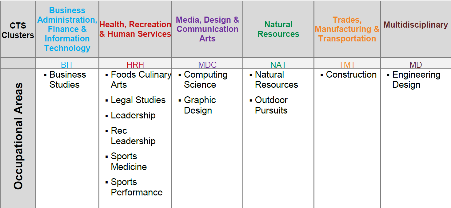 Career and Technology Studies (CTS) and Knowledge and Employability (K&E) pathways build on the Career & Technology Foundations (CTF) inquiry-based, hands-on studies. CTS involves five main clusters composed of occupational areas with industry commonalities.